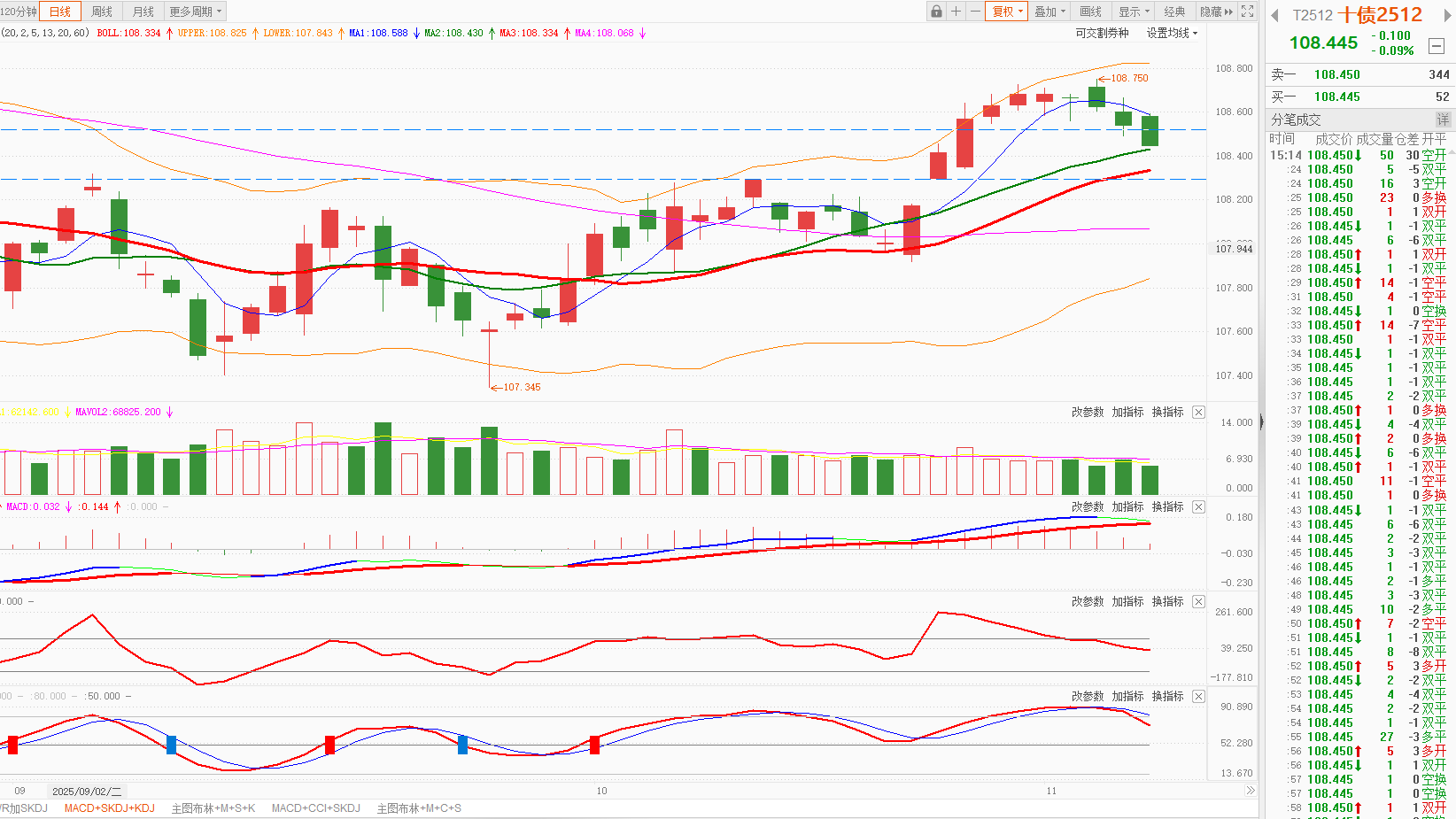 今天国债期货日K线收盘后全部在5日均线之下,接近10日均线,整体走势较弱。