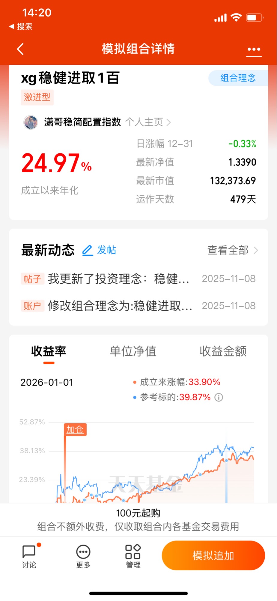 稳健进取1百指数模拟组合成立以来上涨33.9%、年化收益24.97%;