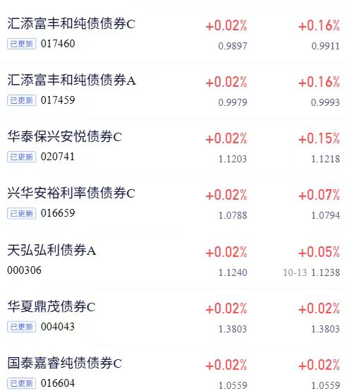 10月的权益市场表现不太稳。还好债券市场迎来连续修复。昨天的利率债,信用债都是晴天。进入新的一天。今天的债券市场依然表现平稳。目前继续看好债券市场的修复行情。$汇添富丰和纯债C(OTCFUND|017460)$昨天爆发了16个蛋。看来9期没有变。还是在坚守超长期国债。长期表现的收益也是不错。