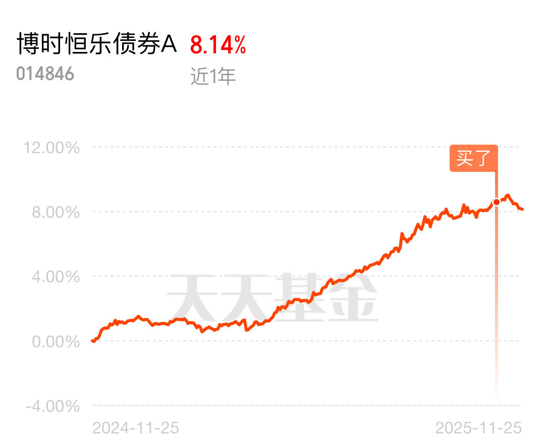 市场来回震荡,固收+策略稳得住,债券当盾、权益当矛,攻守更从容,$博时恒乐债券A$ 近一年年化收益率稳超8%,而且在10月底还分红了,咖啡钱稳稳到账。最近还把一次性能买的上限从500万降到了100万,这体现了在规模扩张与业绩维持之间取得平衡的思路,在保障基金的长期健康运作。11月25日央行开展10000亿元MLF操作,这是连续第九个月加量续作,净投放1000亿元,直接给市场注入了巨量中期流动性。对博时恒乐这类以高等级信用债和利率债为底仓的基金来说,就是直接利好,MLF加量续作推动市场利率下行,基金持有优质债券不仅票息稳定,还能赚差价收益。再看其权益仓位,虽然占比不到20%,但选股太准了!重点布局了高股息红利股和科技龙头,比如中国海洋石油、长江电力,这些股票在国企分红政策强化的背景下,分红稳定,相当于给收益上了双保险;再加上宁德时代、兆易创新这些科技股,最近消费电子复苏、新能源需求反弹,这些标的涨幅都超15%,直接带动基金净值跟涨。现在股市有结构性机会,央行又持续放水,这基债券占比高能抗,股票部分又能蹭到热点,正是逢低布局的好时候。#3800点的A股值得加仓吗?#