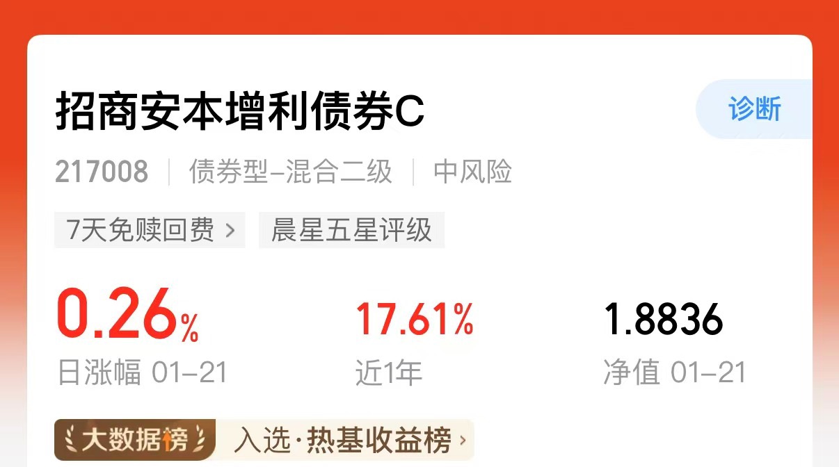 年底了,资金好像都是偏谨慎的,权益市场一直是不上不下,不好把握行情,我觉得目光还是得在固守类的身上,毕竟计较稳健$招商安本增利债券C$ 昨天又收了26个蛋,真是不错,每天都是稳稳的安心