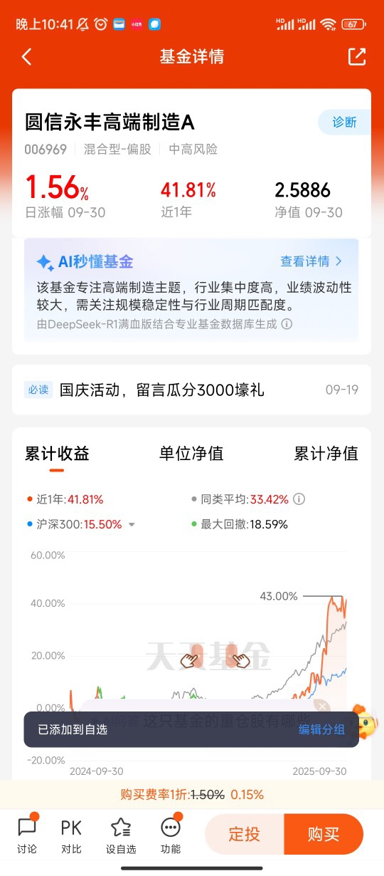 至于今年剩下的时间,我的投资规划很清晰:一方面会继续持有圆信永丰高端制造A,毕竟从国庆见闻来看,高端制造的产业需求还在释放,尤其是政策对“专精特新”企业的扶持力度在加大,基金在这一领域的选股优势能持续发挥;另一方面会控制好仓位,不盲目追涨,逢市场调整时再适度加仓,重点关注基金持仓中是否有新的产业链龙头纳入,确保投资方向始终贴合产业发展的主线。
