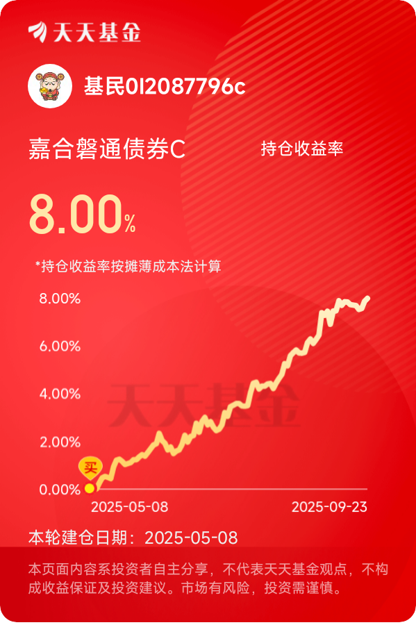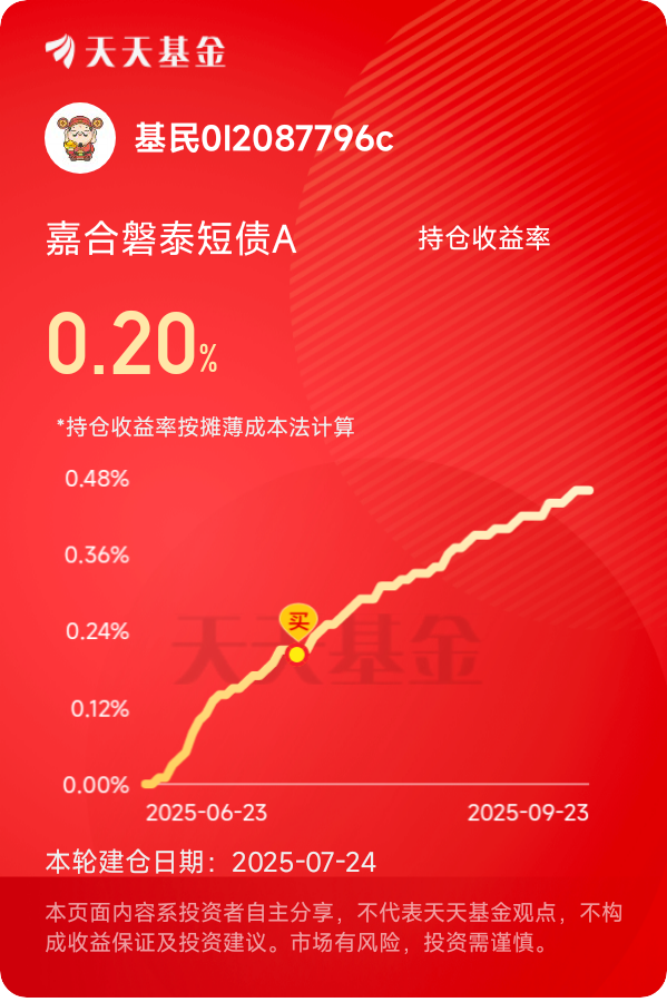 投资中最忌讳盲目跟风追涨,就像旅行时扎堆热门景区往往收获不佳。在当前市场环境下,我坚定持有 $嘉合磐泰短债A$ ,正是看中它的“稳健底色”:近1个月波动仅0.12%,近12个月波动2.19%,通过聚焦短期信用债控制风险,既能为6-12个月不用的闲置资金保值,又能避开市场大幅震荡的冲击,如同旅行时选对了舒适且靠谱的住宿,让人安心。