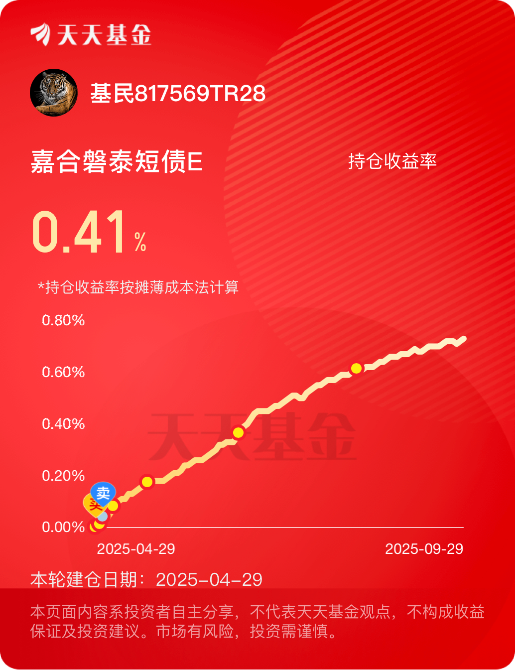 #分享国庆见闻,晒收益,瓜分好礼!# $嘉合睿金混合发起式A$ 一如既往底舱的最优选择,肯定买它享假期票息收益。同类型的$东海祥苏短债E$ 去年很好,但是今年债市回调的时候明显不如磐泰。不知道什么时候可以再入华子了,去年真的爽歪歪$华泰保兴安悦债券C$
