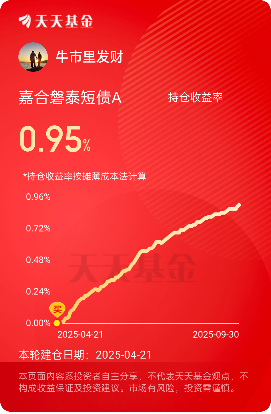 眼下货币政策持续发力,稳增长政策也在加码,消费回暖大概率只是时间问题。我打算逐步配置些稳健型产品,就像$嘉合磐泰短债A$ 这类波动较小的基金,既能把握政策红利,又避免短期市场起伏。机会总在无人问津处酝酿,等所有人都看见复苏,可能就错过了最好的布局时机。#晒收益#