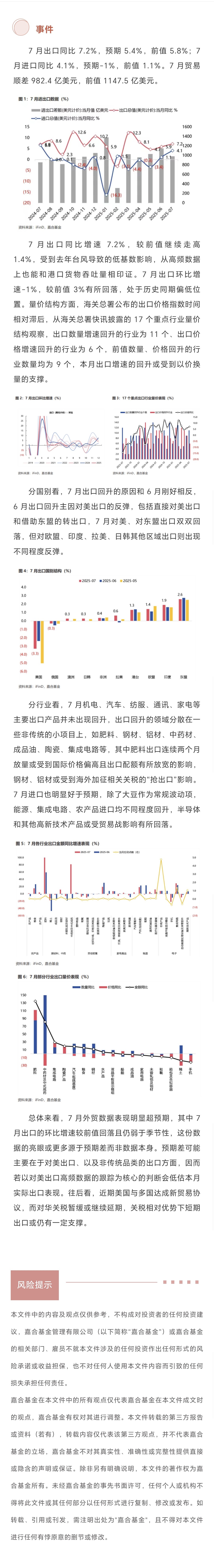 嘉合基金7月进出口数据点评|出口数据大超预期,对美出口再度回落