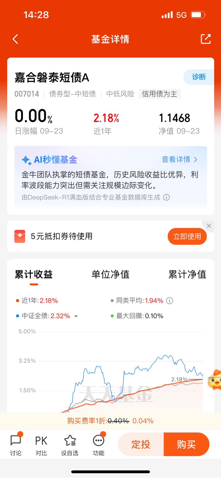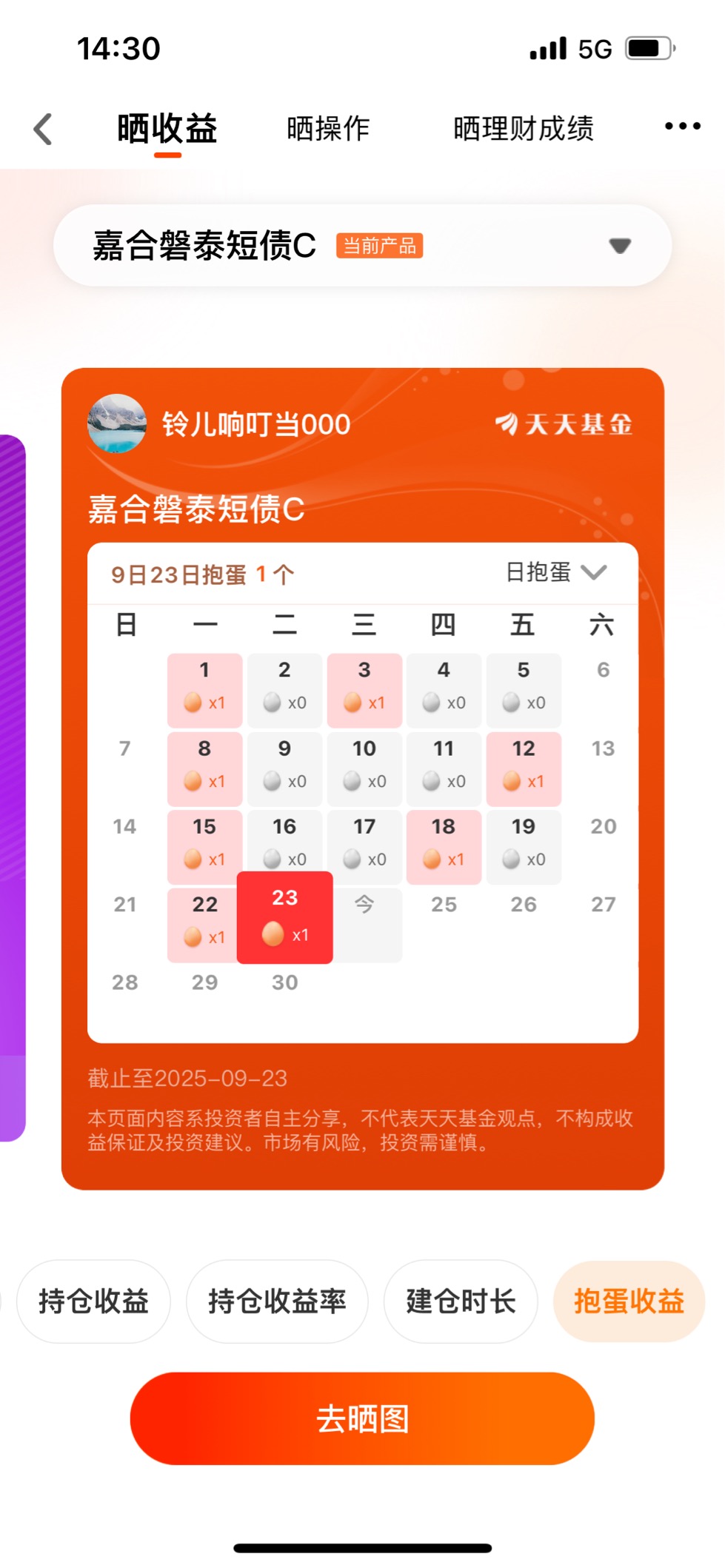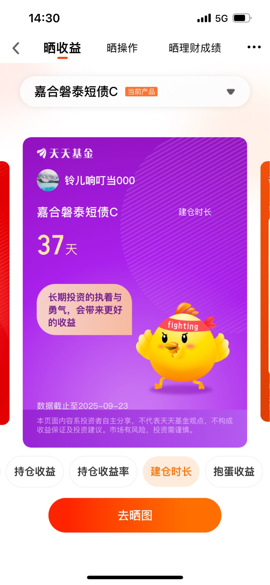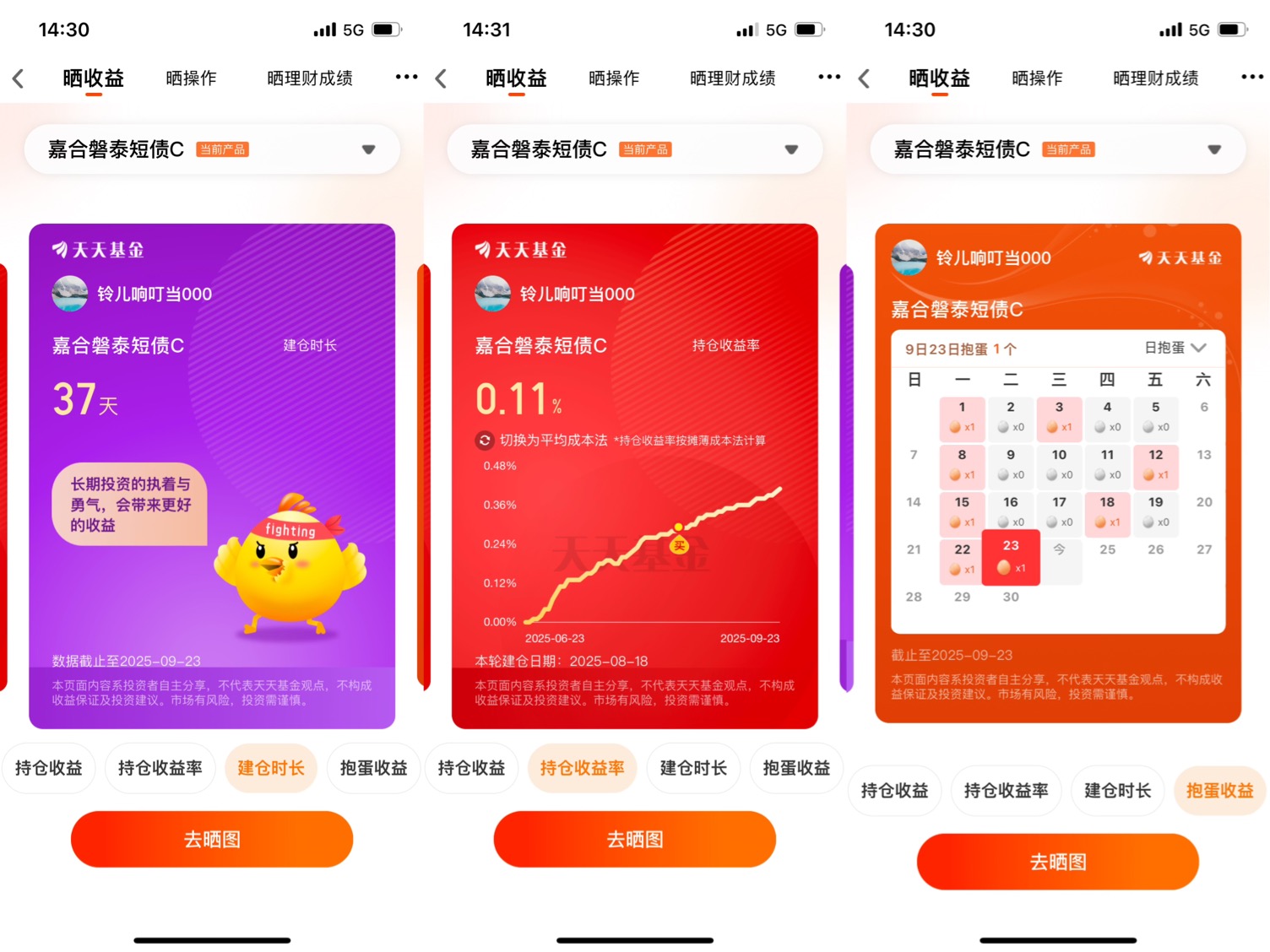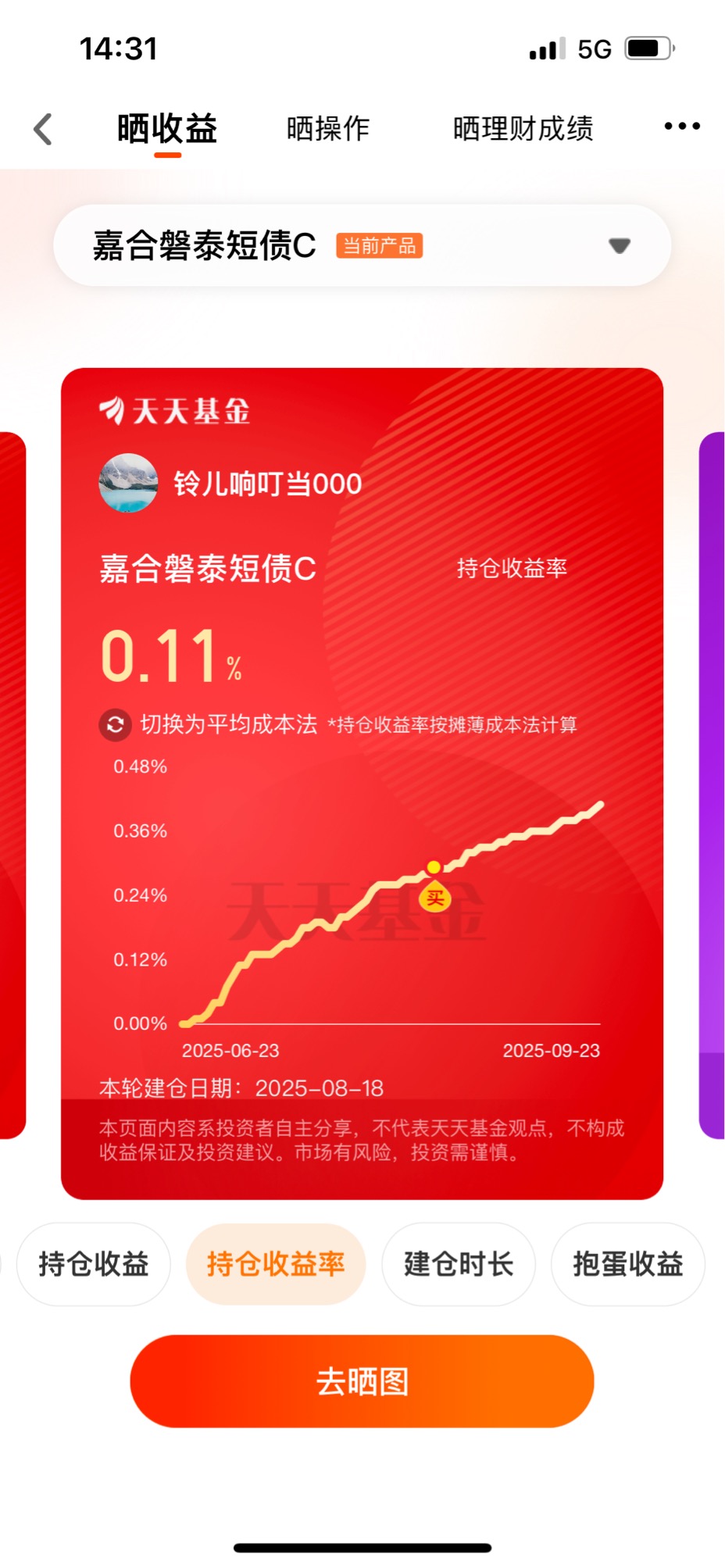 最开始选它,就是看中短债基金稳当。我这人胆子小,受不了大起大落,短债这种主打稳健的就很对我胃口。从8月18日建仓到现在,看着那个持仓收益率从0慢慢涨到0.11%,虽然涨幅不算惊天地泣鬼神,但胜在稳当,每天跟“抱蛋”似的,打开天天基金看,那些个有收益的日子,就跟捡着小彩蛋似的,心里别提多踏实了。