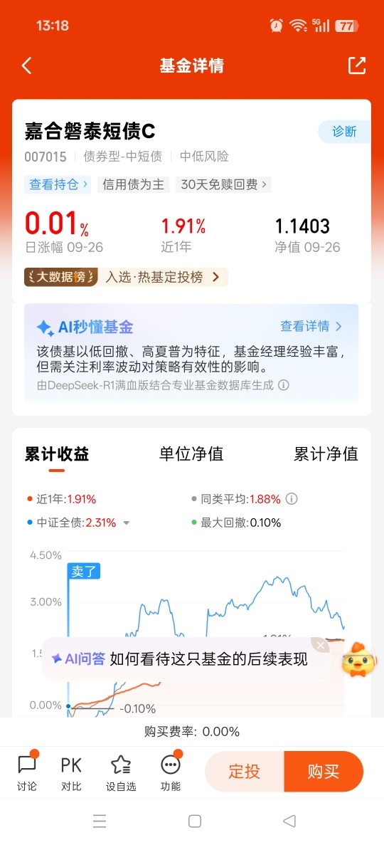 当然,由于投资是一件长期的事情,稳健增长才是最好的选择,在配置权益资产的同时,配置稳健产品同样不可少。我有持有嘉合磐泰短债,该产品主要AAA信用债,有类货币基金之称,稳定有保障,长期向上趋势十分明确,取得正收益概率非常高,是平衡风险非常好的选择。另外,国庆长假即将来临,债基在假期期间同样有收益,也可以减少假期不确定性因素带来的影响,更加稳定。