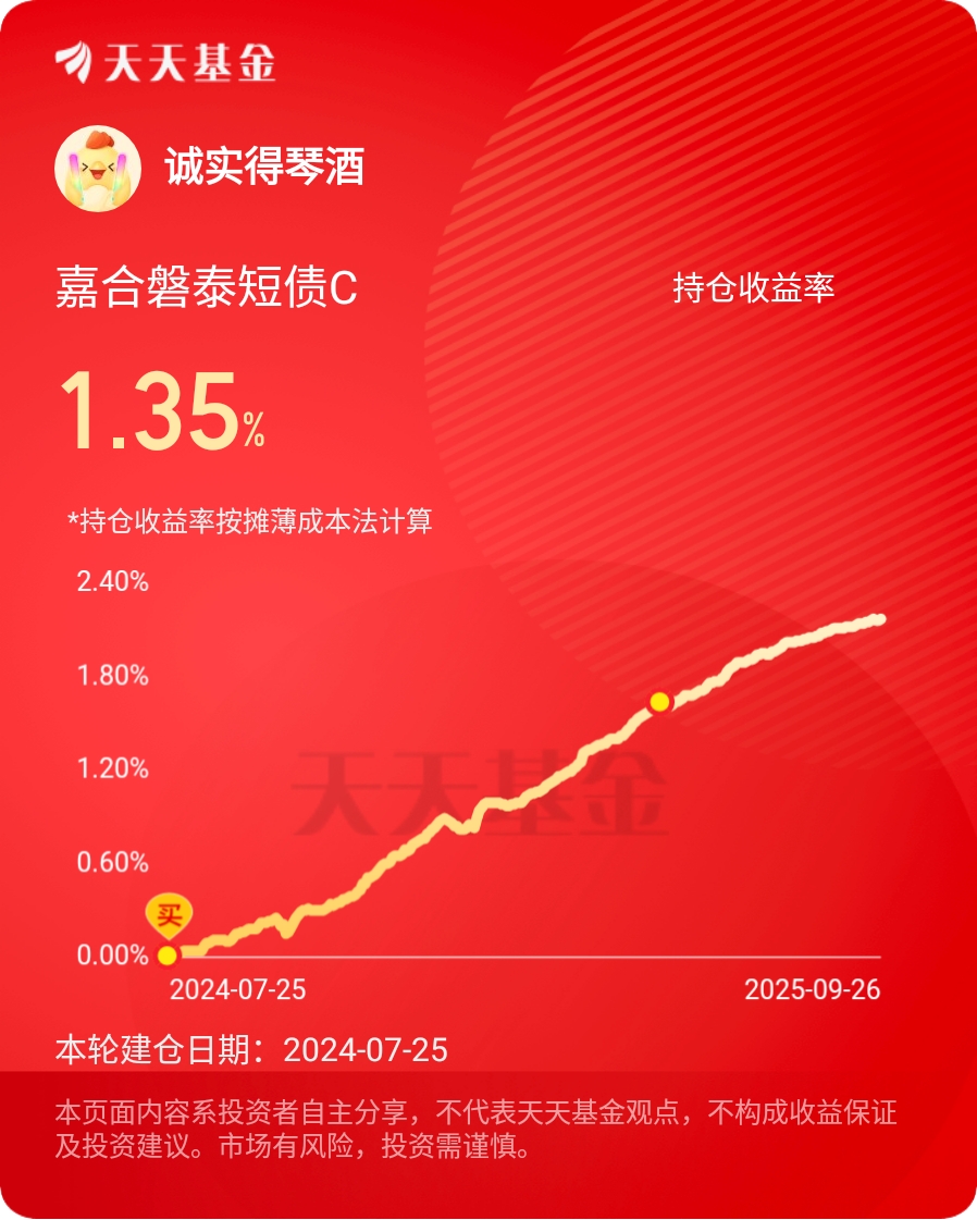 #分享国庆见闻,晒收益,瓜分好礼!#假期在景区商店排队付款时,听见有人抱怨“闲钱放银行卡里没收益,出去玩都觉得亏”。这倒让我想起嘉合磐泰短债C——假期里闲钱不用的时候,既能灵活存放不耽误随时消费,还能安稳赚份票息收益,比让钱“躺”活期划算多了。这不就是从旅行日常里,挖到的适合普通人的闲钱理财小机会嘛。#晒收益#