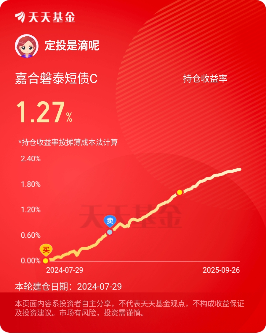 假期去周边古镇散心,排队等游船时听到邻座阿姨吐槽“闲钱放活期太浪费,又不想投风险高的”,瞬间联想到手里持有的嘉合磐泰短债C。
