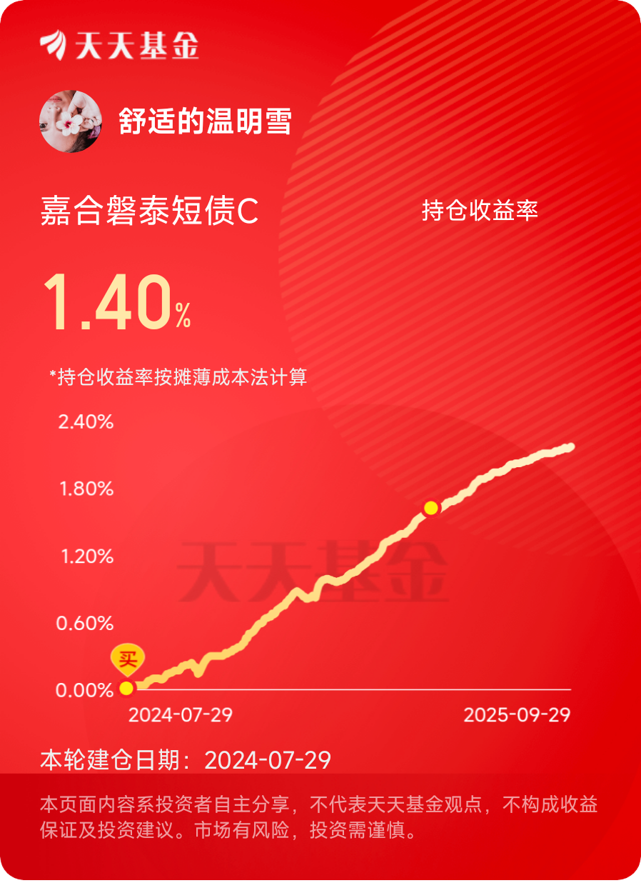 #分享国庆见闻,晒收益,瓜分好礼!# 假期持基选它:$嘉合磐泰短债C$