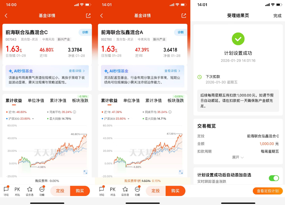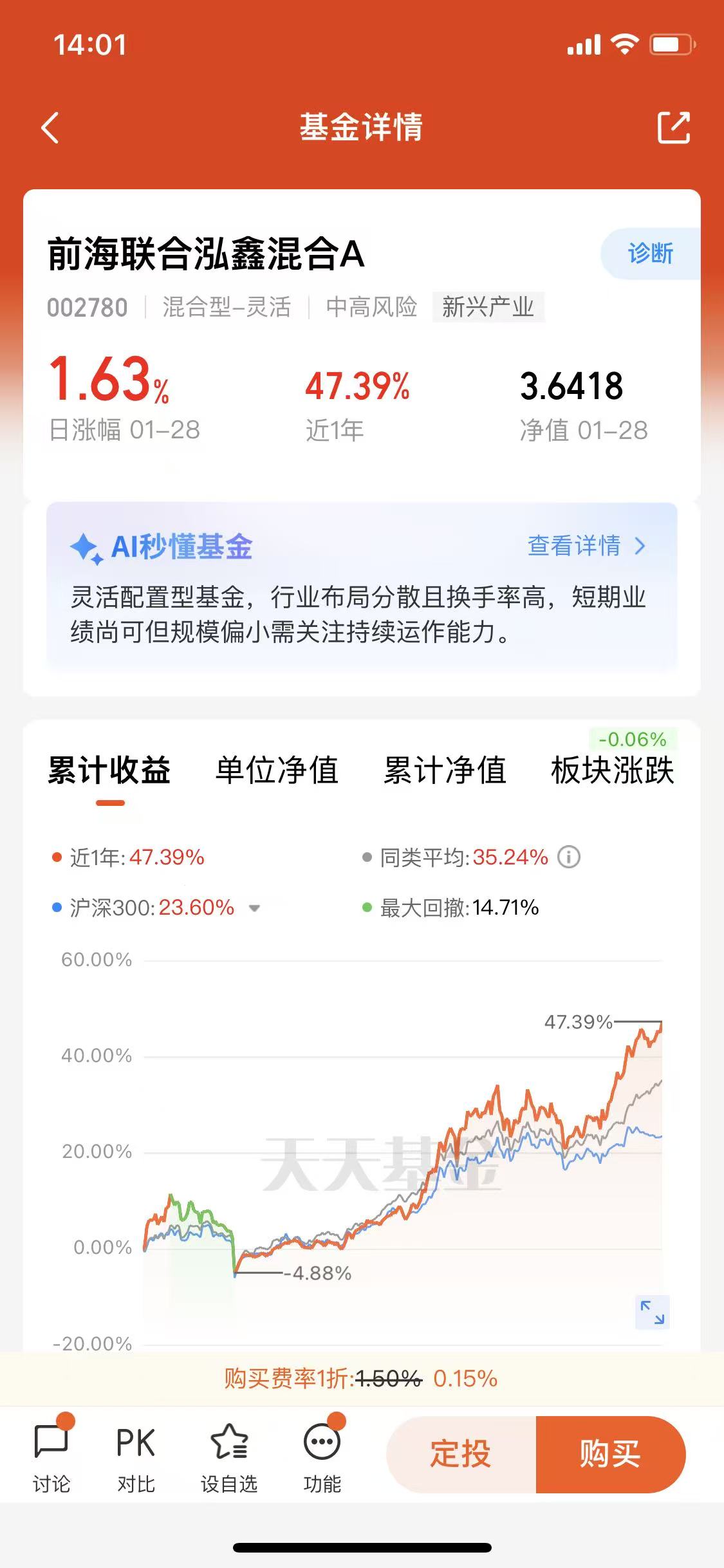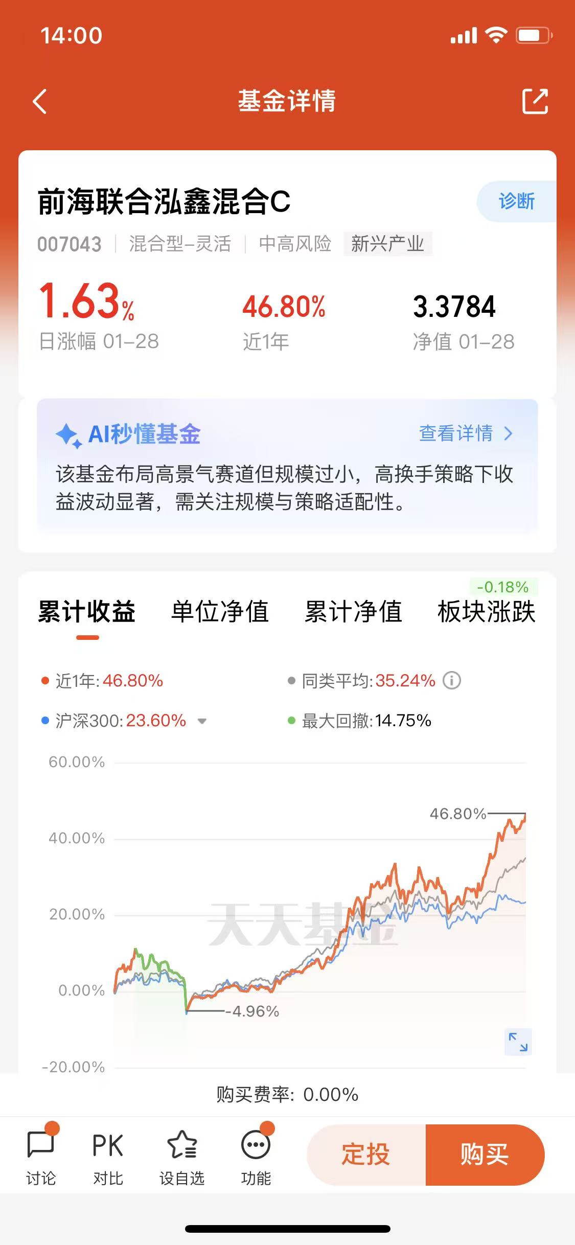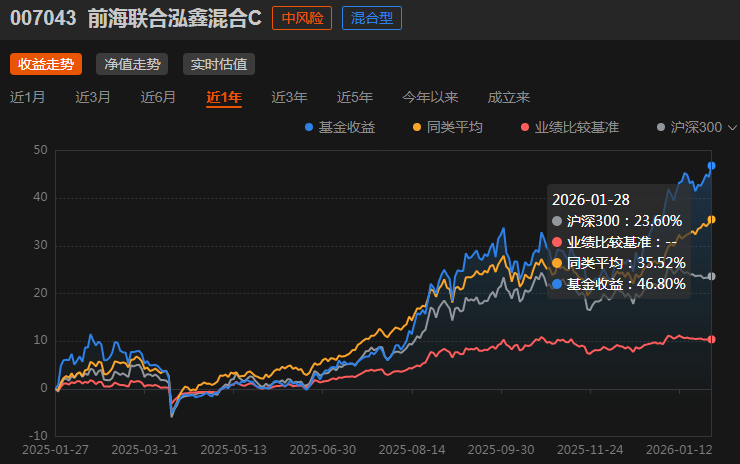 选对双主线布局的标的,说难不难、说易不易——普通人自己选股,既要盯科技赛道的政策和技术变动,又要跟踪周期赛道的供需变化,精力根本不够。所以对我们普通人来说,最省心、最高效的方式,就是选一只精准贴合“科技和周期”均衡布局理念的基金,比如前海联合泓鑫混合C(007043)。
