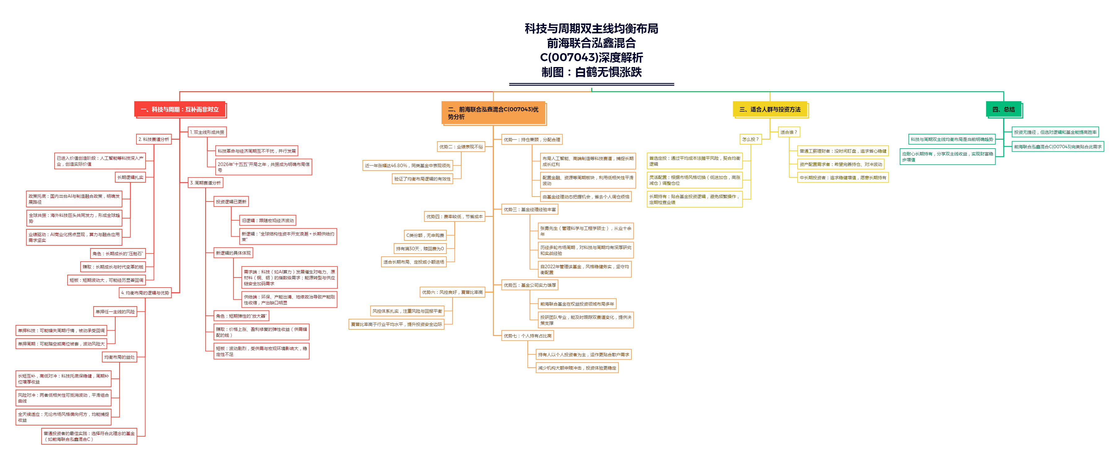 接下来白鹤君就具体谈谈自己对于科技和周期双主线的理解,并深度测评下前海联合泓鑫混合C(007043)基金,文章有点长,这里也是做了个思维导图,方便大家整理思路,可以点开放大了看下的。