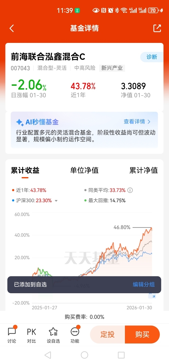 2.周期主线:把握经济的脉搏跳动。当前周期行业的投资驱动力,正从传统的宏观经济复苏叙事,转向由全球性、结构性资本开支浪潮与长期供给约束共振所主导的新逻辑。需求端,以人工智能基础设施建设为核心的全球科技投资正进入算力需求暴增的阶段,其对电力、数据中心及上游原材料(如铜、铝)的需求呈指数级增长;供给端,在环保政策、产能出清或地缘政治等因素影响下,供给端出现刚性收缩或瓶颈。因此,关注周期主线,捕捉价格弹性与盈利修复的戴维斯双击机会。$前海联合泓鑫混合C$ 在资产配置层面遵循了“科技+周期”的均衡配置理念,从最新季报来看,其投资组合既布局如人工智能、高端制造等具备高增长潜力的科技赛道,以捕捉长期成长机遇,同时也配置金融、资源等周期价值板块,利用其与科技资产较低的相关性,在经济波动时提供支撑、平滑整体波动。通过基金经理在两大能力圈内的主动管理,实现攻守兼备。因此,本基金或许更适合长期持有,以更好地帮助投资者在穿越周期与拥抱创新之间获得较好的投资体验。@前海开源基金