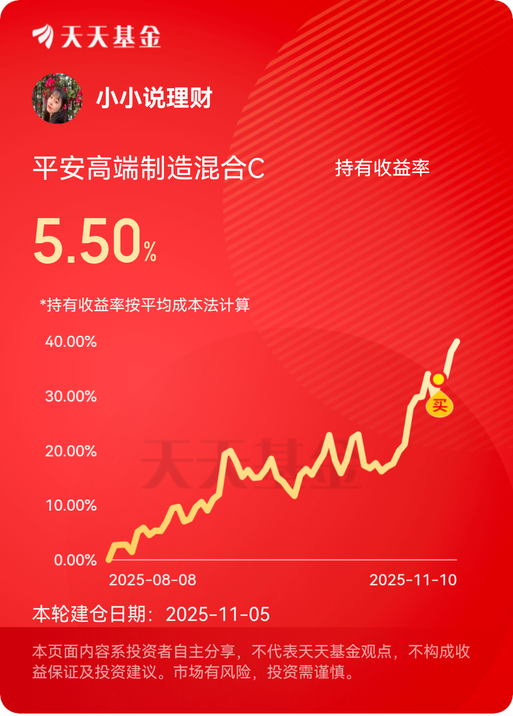 宝子们好呀,昨天晚上更新净值的时候,小小很惊喜,因为昨天新能源赛道普跌,但是俺的光储概念基$平安高端制造混合C$ 逆势上涨1.34%,净值直接四连涨,近两三周的震荡市场节奏里,这只几乎每天都涨,可以说是最近最亮眼的基了~~爱了爱了,可惜小小目前才只有底仓,最近会耐心盯扩仓点!