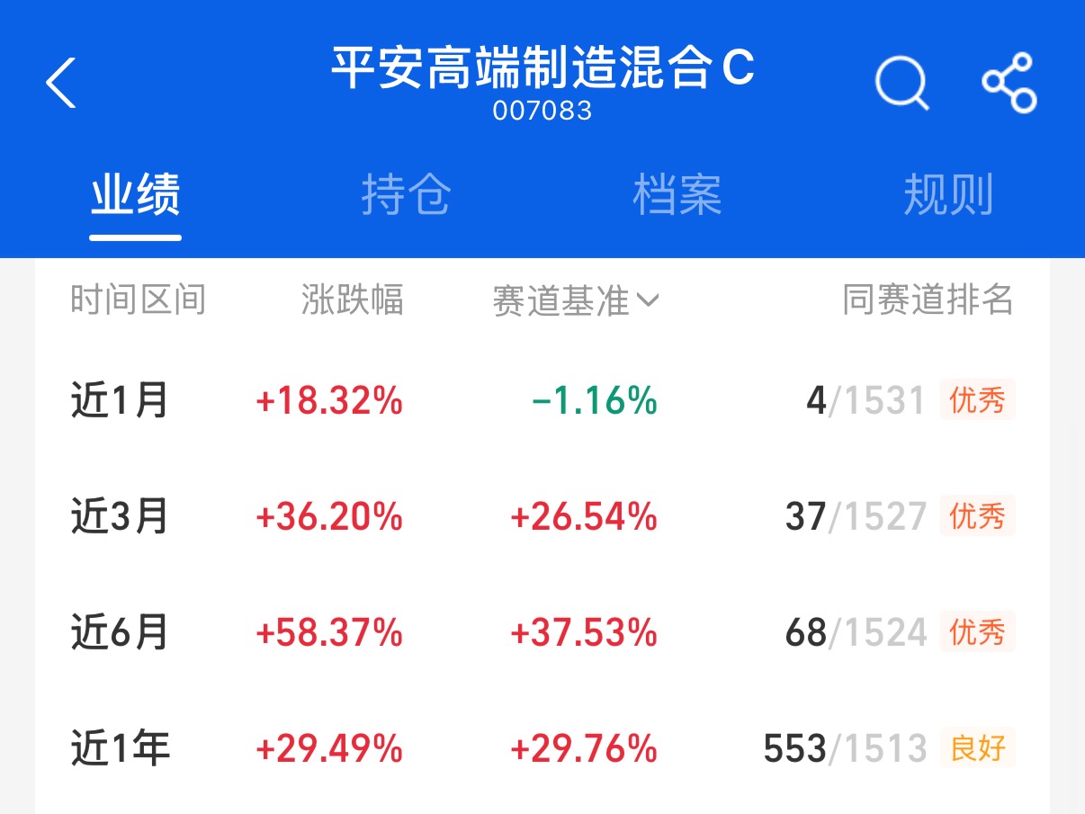近期市场行情波动不断,板块轮动加快,科技连续回调了几日,光伏、新能源等也不例外,不过我觉得光伏、新能源等后期补涨空间挺大的,拉长收益看也还不错,这个$平安高端制造混合C$ 近一个月涨了18.32%,近三个月涨了36.20%,近半年涨超58%,各阶段业绩表现都很不错,逢低我跟上了,期待吃肉