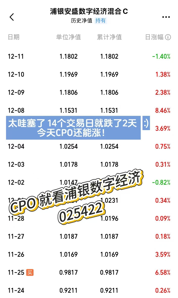 能涨抗跌的CPO当属黑马基$浦银安盛数字经济混合C$ ,CPO基本确定反弹趋势,回调没跟上的要拍断大腿了,今天继续涨