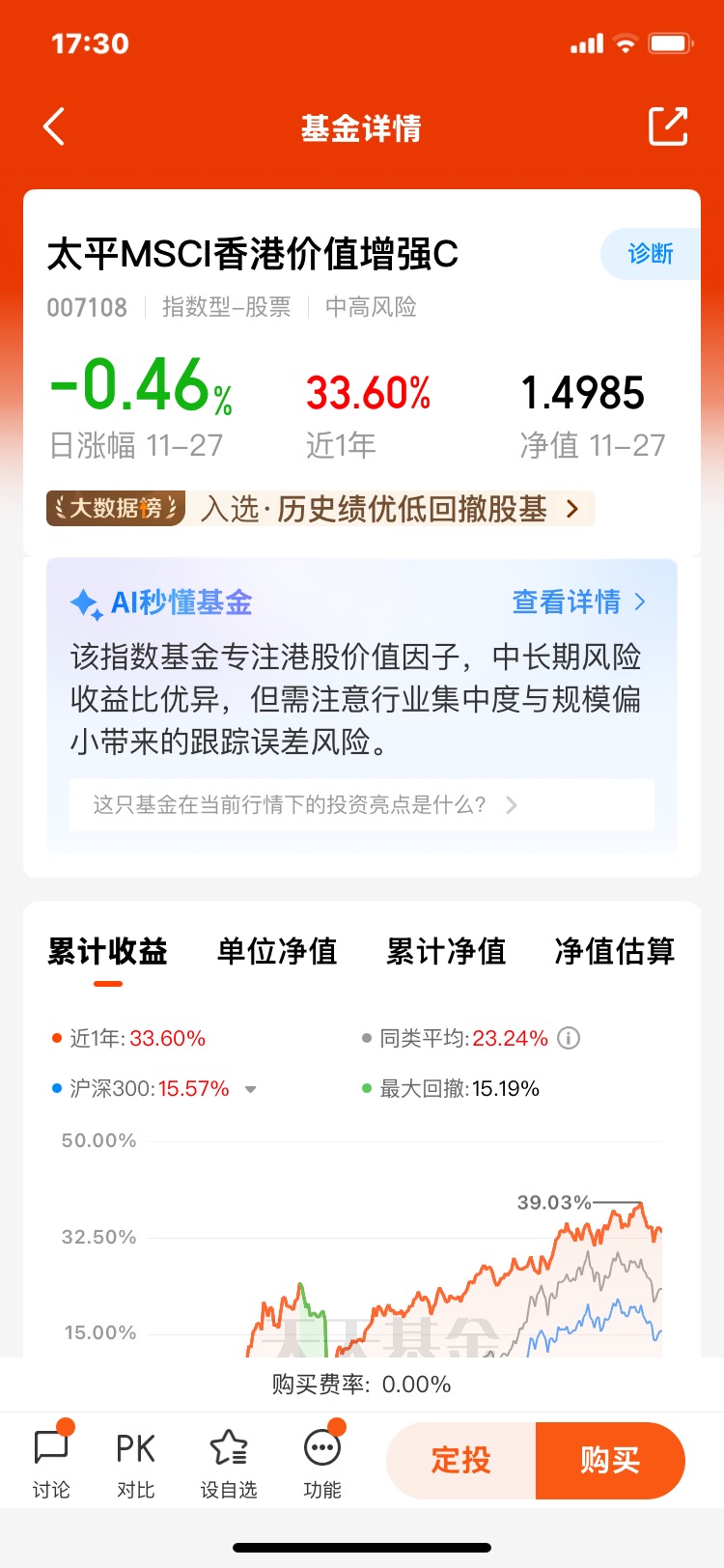 说到具体的投资工具,就来说说$太平MSCI香港价值增强C(OTCFUND|007108)$吧。作为指数型基金,它就像一台智能选股机器,严格按照指数配方进行投资,避免了人为情绪的干扰。