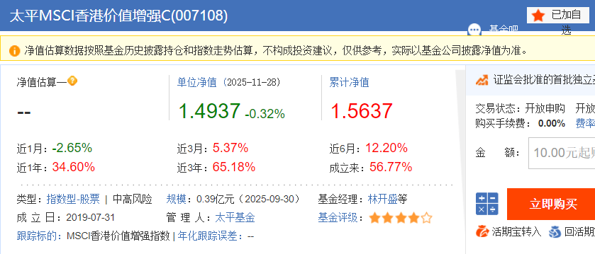 基金风险:太平 MSCI 香港价值增强指数 C(007108)的业绩依赖于标的指数的表现,若指数下跌,基金净值将同步调整;同时存在跟踪误差、流动性风险、汇率风险等,投资者需仔细阅读基金合同、招募说明书等法律文件,充分了解基金的风险收益特征。