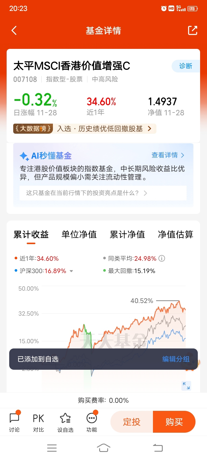 #港股未来你如何投资?# 我看好$太平MSCI香港价值增强C$ !我接触港股其实不算早,最开始是被朋友“安利”着试了点指数基金,后来慢慢就认准了太平MSCI香港价值增强C——主要是它的低估值策略太对我胃口了,持仓个股加权市盈率常年10倍以下、市净率0.8倍左右,这种“安全垫”在21-23年的弱市里尤其靠谱,每年都能拿到正收益,24年到现在又跑赢了恒生指数和沪深300,算是把“攻守兼备”这四个字做实了。
