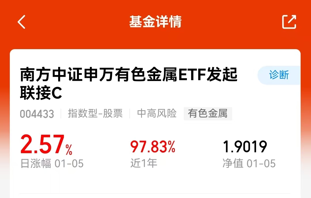 今天买了点$南方中证申万有色金属ETF发起联接A$(004432)。这两天市场不错,今天预估表现挺好。现在这个时候,我觉得挺适合看看这种品种看看业绩,这基金近一年97%的涨幅,足够说明一切了。现在只是开始,值得参与。#2025超额关键词#