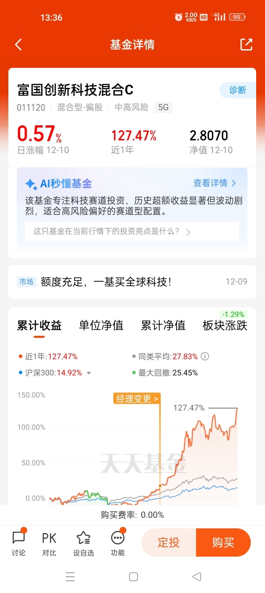 最近市场都在回调,但是这个比较正常,毕竟涨了这么多$富国创新科技混合C$一年收益