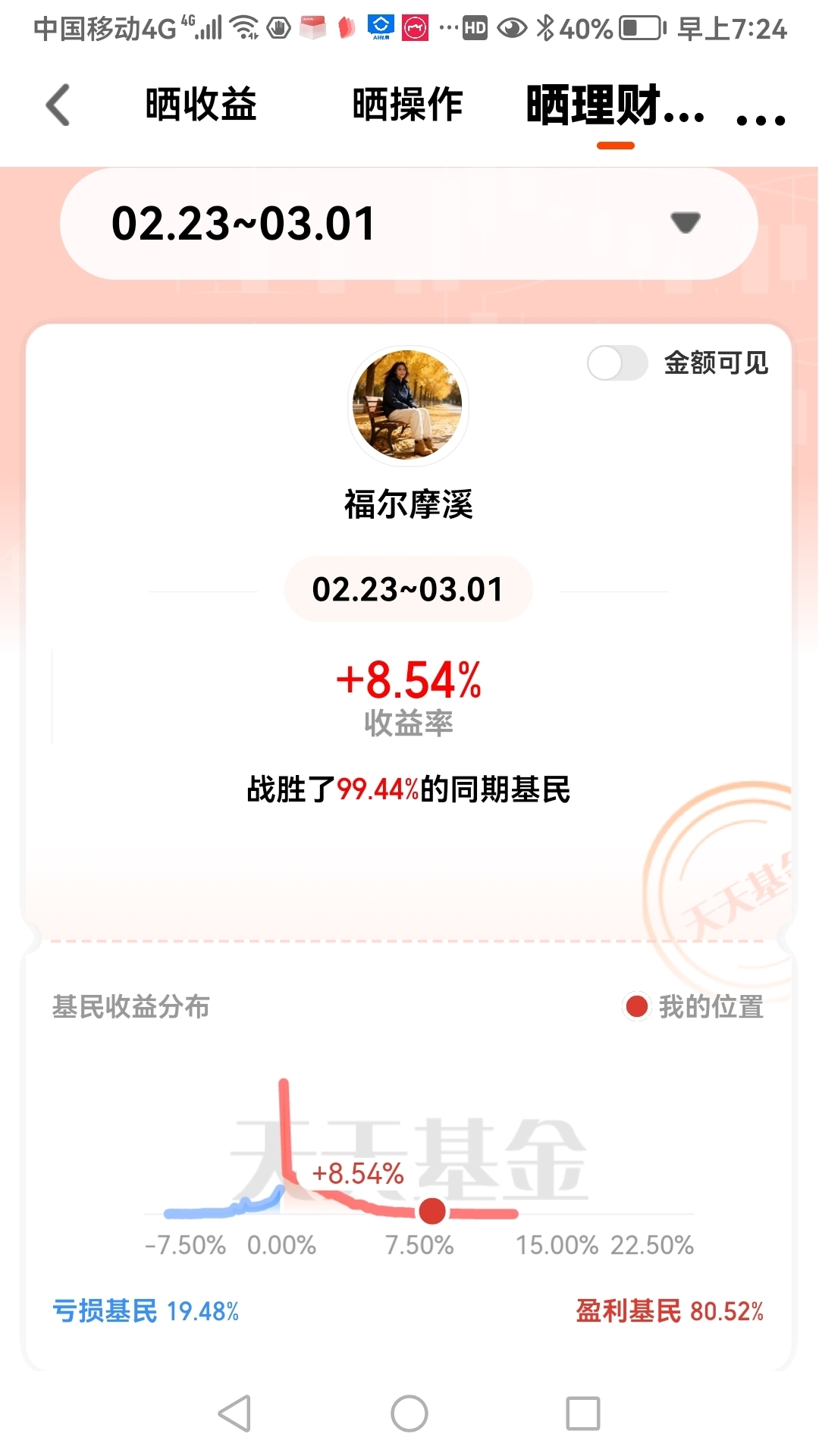 春节后那一周,账户收益达到了8.54%,跑赢了99.44%的同期基民;进入3月以来,仅两个交易日,收益已经有4.05%,胜过了99.18%的同期基民。虽然“赛程”才刚开始,但目前的攻防转换节奏,我挺满意。