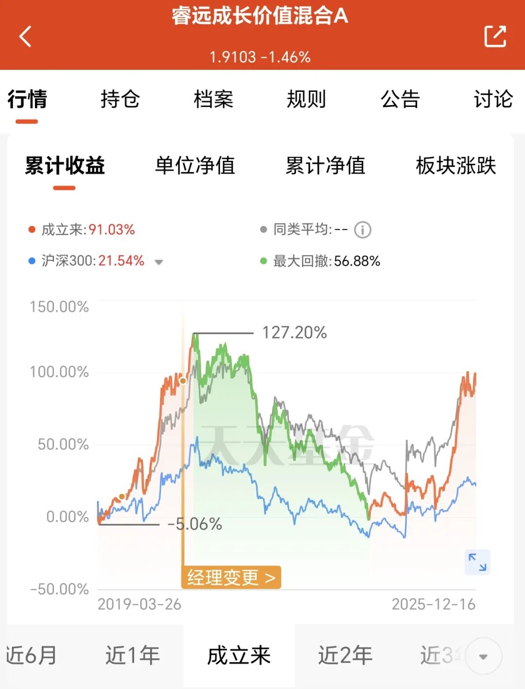 然而,2021-2024年熊市给了市场一记响亮的耳光。傅鹏博管理的睿远成长价值最大回撤达到56.88%,远超投资者预期,睿远的“光环”就此破灭。