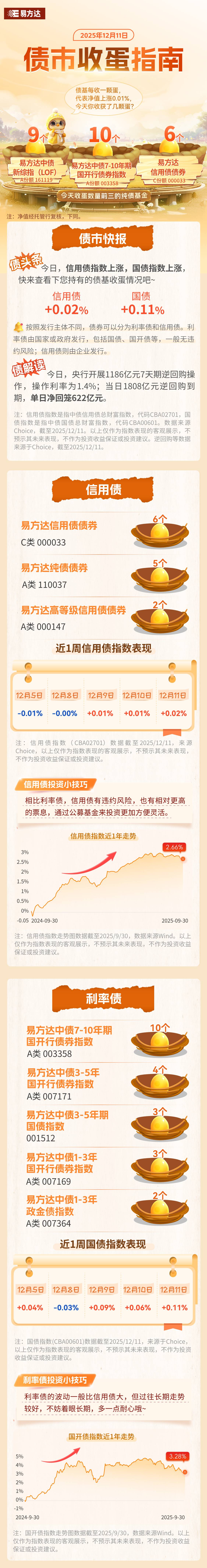 12月11日,信用债指数上涨、国债指数上涨,快来查看您持有的债基收蛋情况吧!