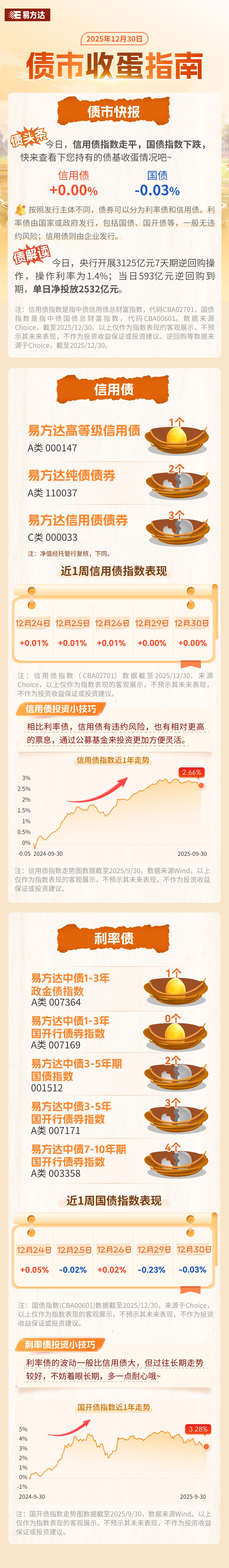 12月30日,信用债指数走平、国债指数下跌,快来查看您持有的债基收蛋情况吧!