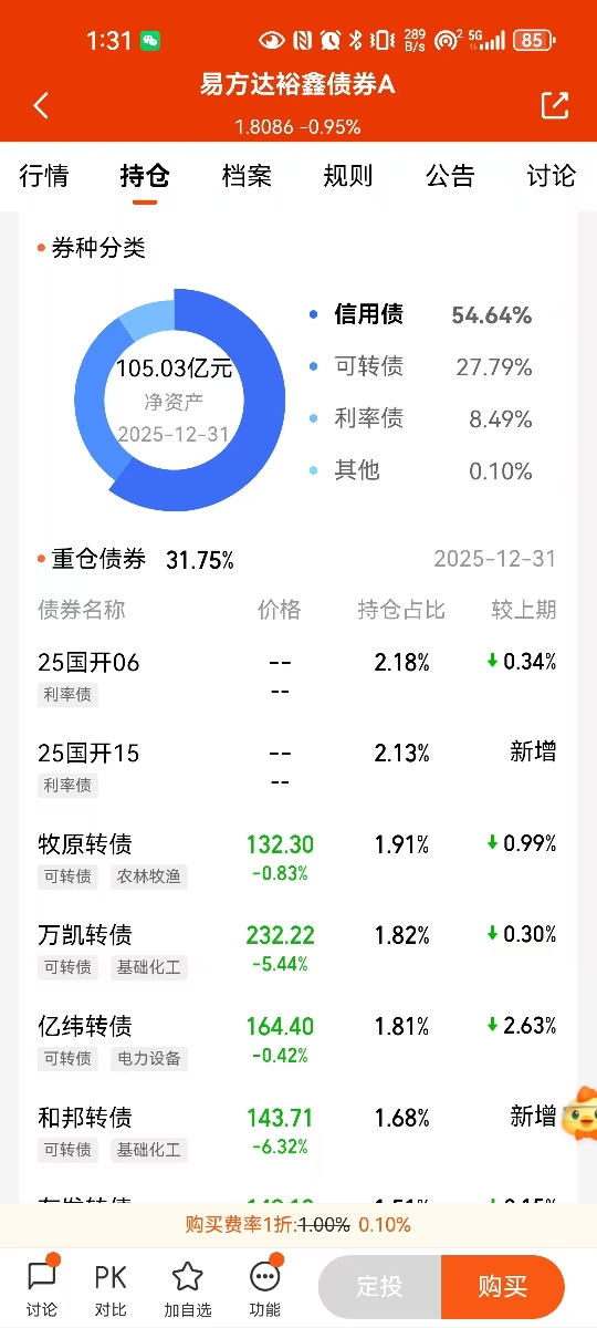 1 月央行净投 1 万亿流动性,地方债卖爆 8633 亿。我定投的基金 近 1 月涨 3.05%,虽说没沪深 300 反弹猛,但看持仓 83% 都是国债 + 高评级政金债,15% 配置消费科技股,比股票基金稳太多。$易方达裕鑫债券A$ $易方达裕鑫债券C$