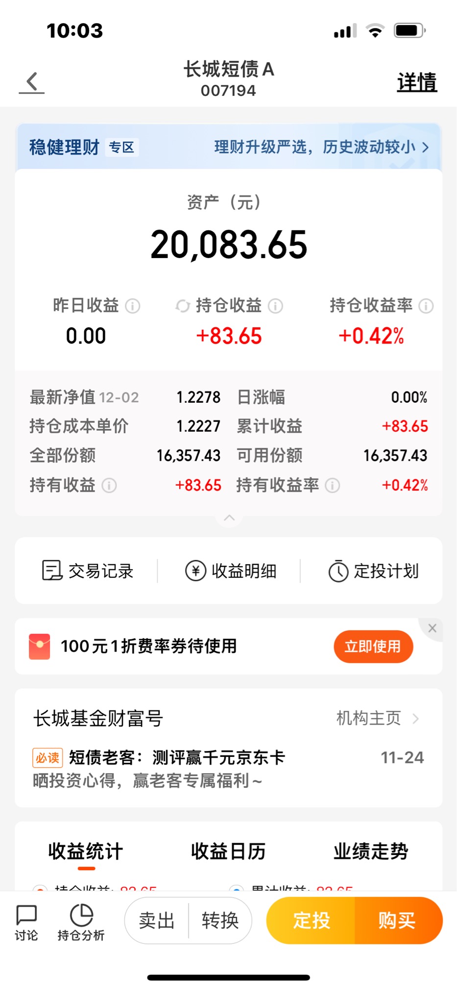 第一次买债基 各种查询后选了长城短债 ,体验感极佳,股债平衡是我追求的投资框架 ,选对基金很重要,希望越来越好 在理财路上经验丰富,收获满满