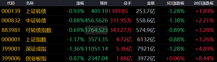 目前权益市场的跌幅已经比较大了,就连支撑力比较强的创业板指跌幅也达到了0.87%,而上证指数和深证成指跌幅已经突破1个点。可转债方向也是快速下探,目前上证转债和中证转债指数的跌幅也都接近1个点。