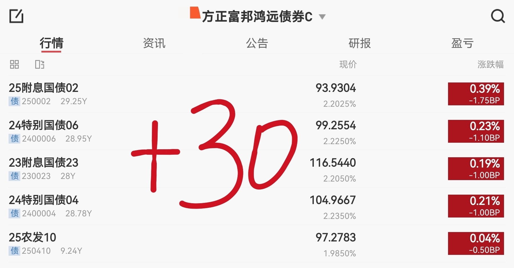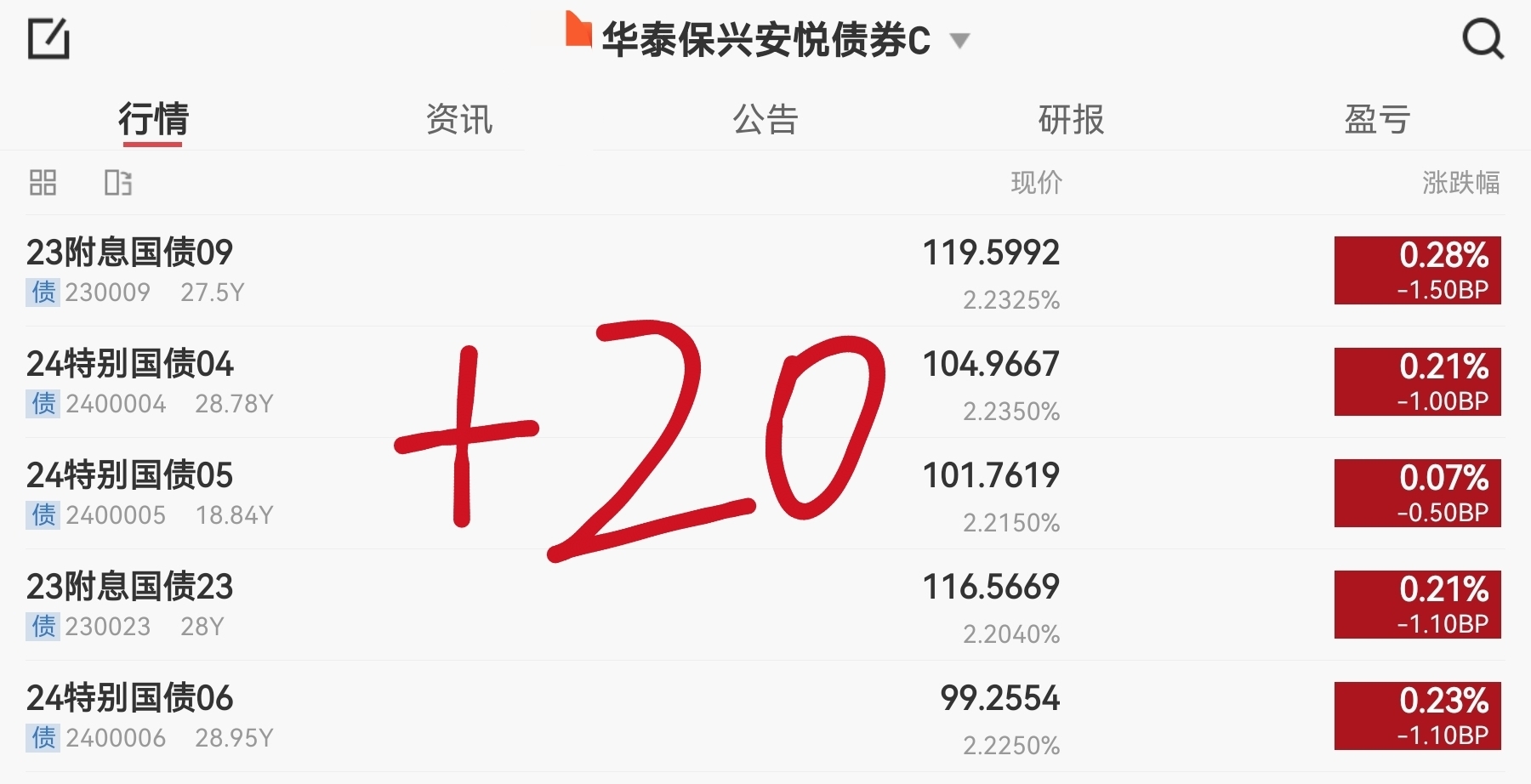 太不容易了,终于看到利率债拉升了,目前长端债券大部分已经翻红了,华泰保兴安悦债券C的估值也有绿转红,目前收7个蛋5。