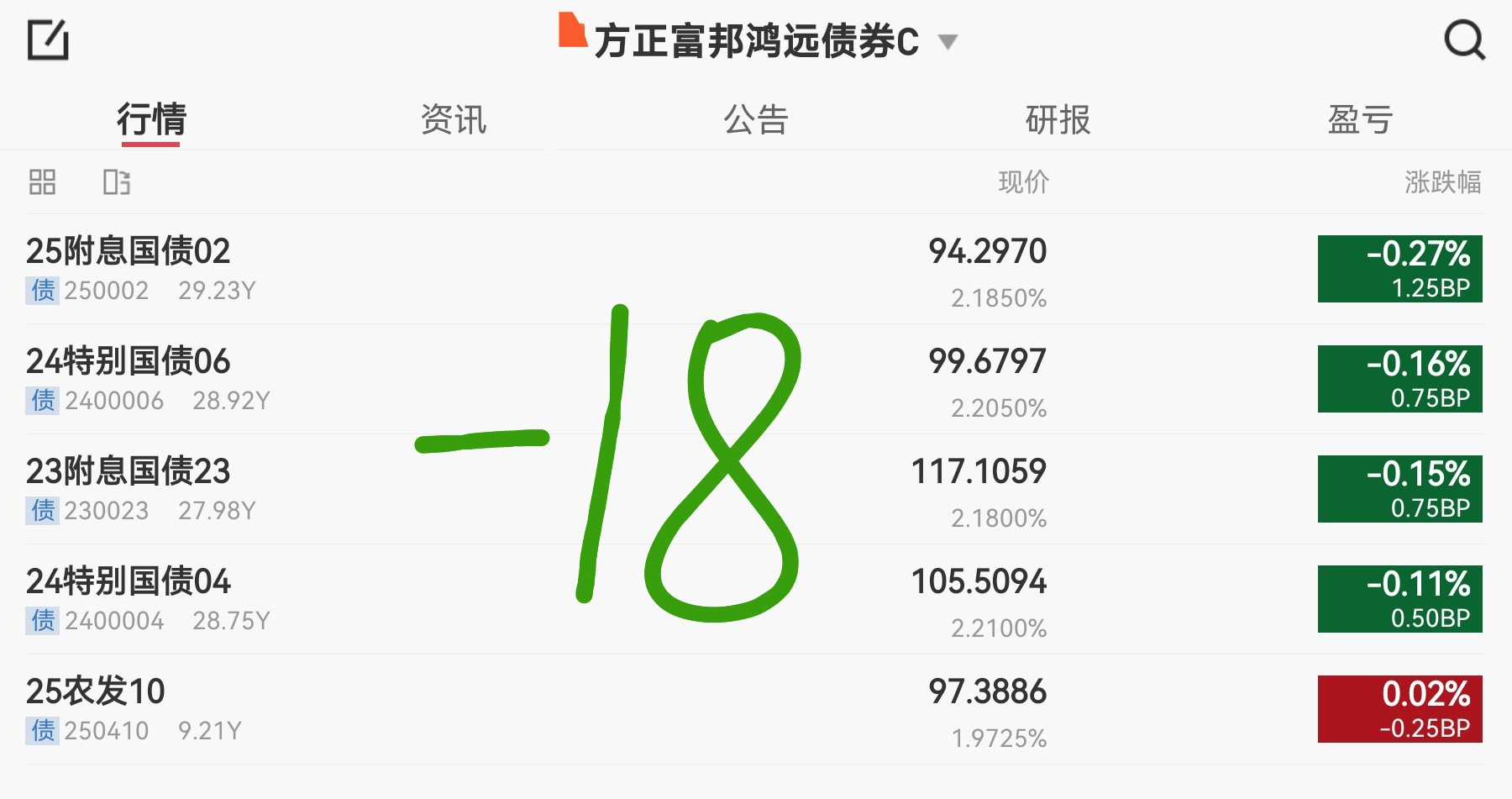 下午权益市场持续拉升利率债,保持缓慢下行走势,目前来看,30年期国债活跃券的收益率下行幅度偏大。所以,方正富邦鸿远债券C目前丢18个蛋。
