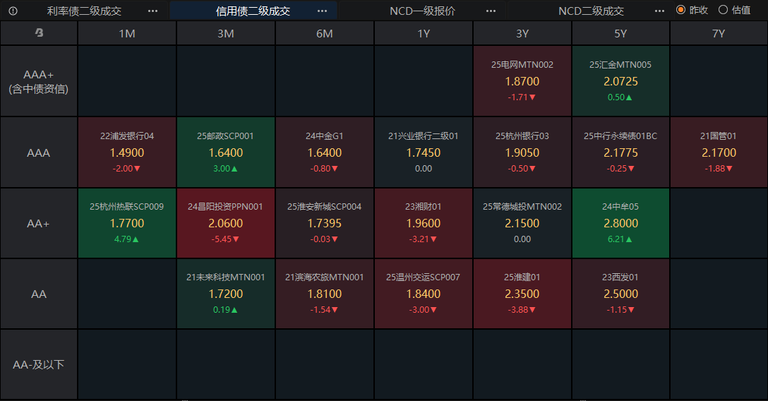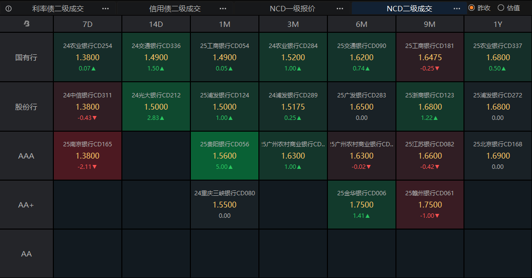 同业存单今天表现不太理想,早盘平开低走,盘中一直是缓慢下行状态,目前来看,盘面绿多红少。