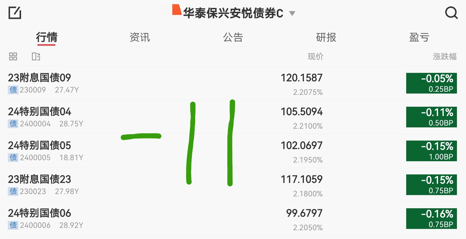 $华泰保兴安悦债券C(OTCFUND|020741)$$广发双债添利债券E(OTCFUND|009267)$$富国久利稳健配置混合E(OTCFUND|019370)$$富国优化增强债券E(OTCFUND|018980)$$国金惠盈纯债C(OTCFUND|006760)$$方正富邦鸿远债券C(OTCFUND|015909)$$南方中债7-10年国开行债券指数E(OTCFUND|013594)$