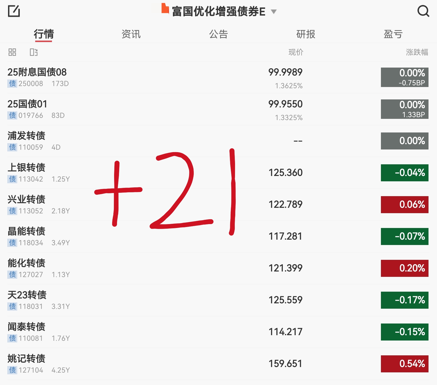 虽然今天权益市场和可转债市场表现都很好,但是富国优化增强债券E持仓的个股表现很一般,持仓的个券整体也是中等偏上的表现,所以目前收21个蛋。