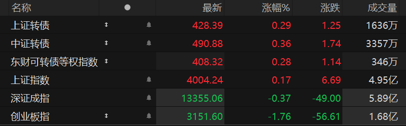 下午开盘以后,权益市场冲高回落,目前大盘已经翻红,不过涨幅较小;而深证成指和创业板指还处于下跌状态,创业板指跌幅缩窄至1.76%。可转债没有太大变化,一直在零线上方做窄幅震荡,目前可转债三大指数涨幅都在0.25%以上。