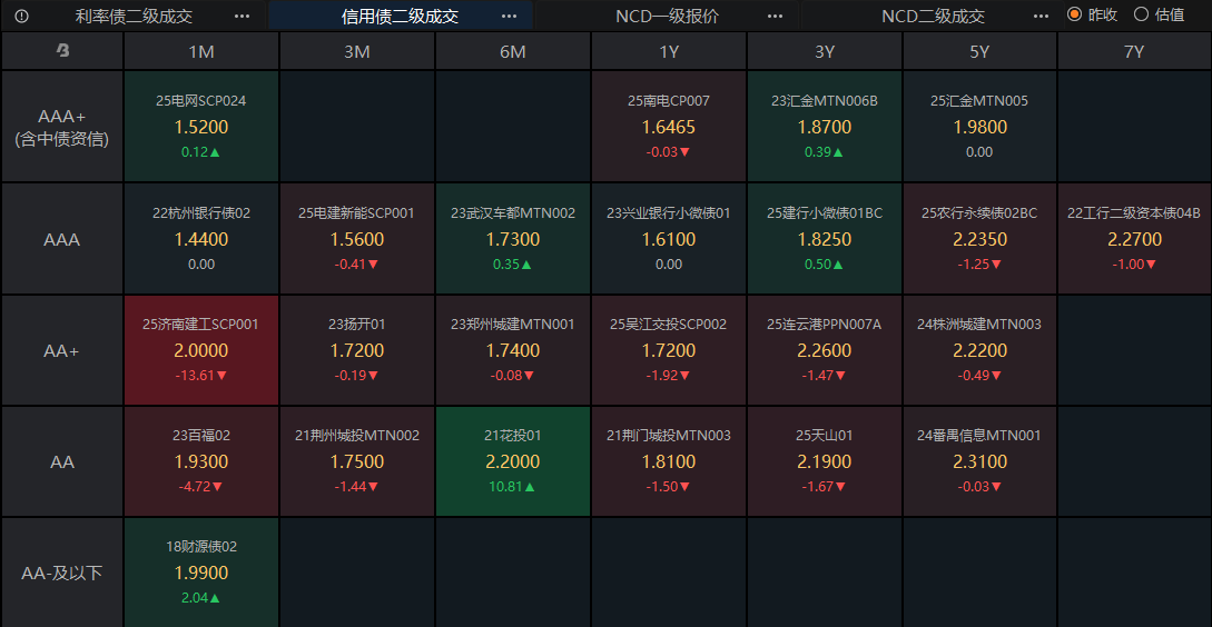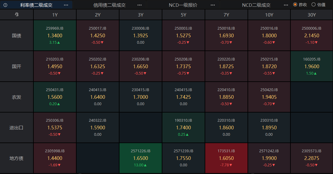从成交矩阵图来看,翻红债券没有明显增多,但是上涨债券的收益率下行幅度有一定程度扩大。