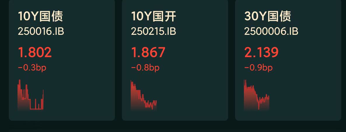 十年期国债收益率:1.802%,-0.3BP(国债收益率越跌,债市越涨)