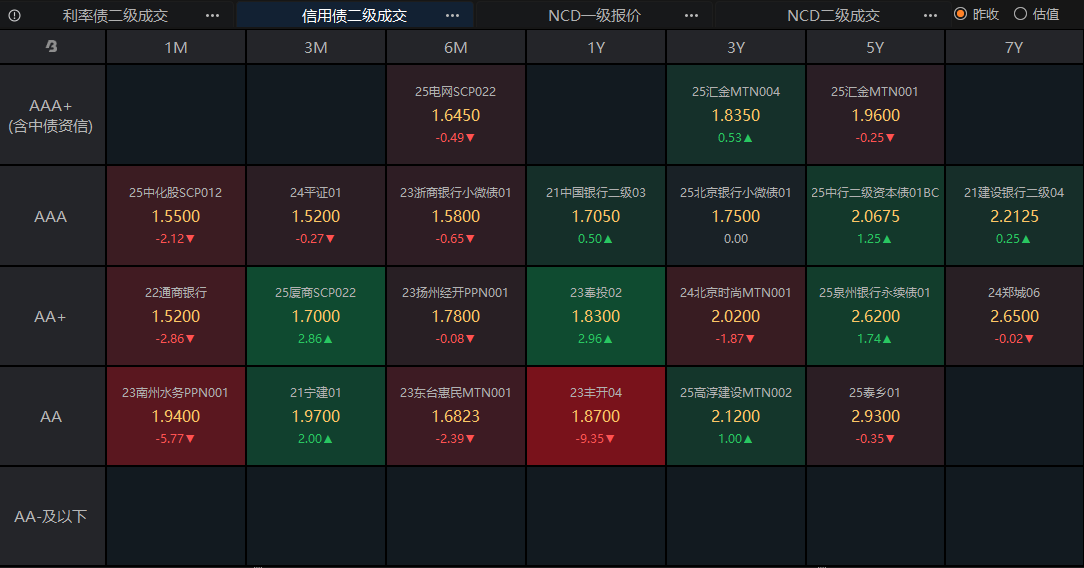 债券市场这边整体表现还算稳定,利率债除了30年期国债有一定程度回落以外,其他年期债券整体还算稳定;信用债和同业存单保持稳定,变化不大。