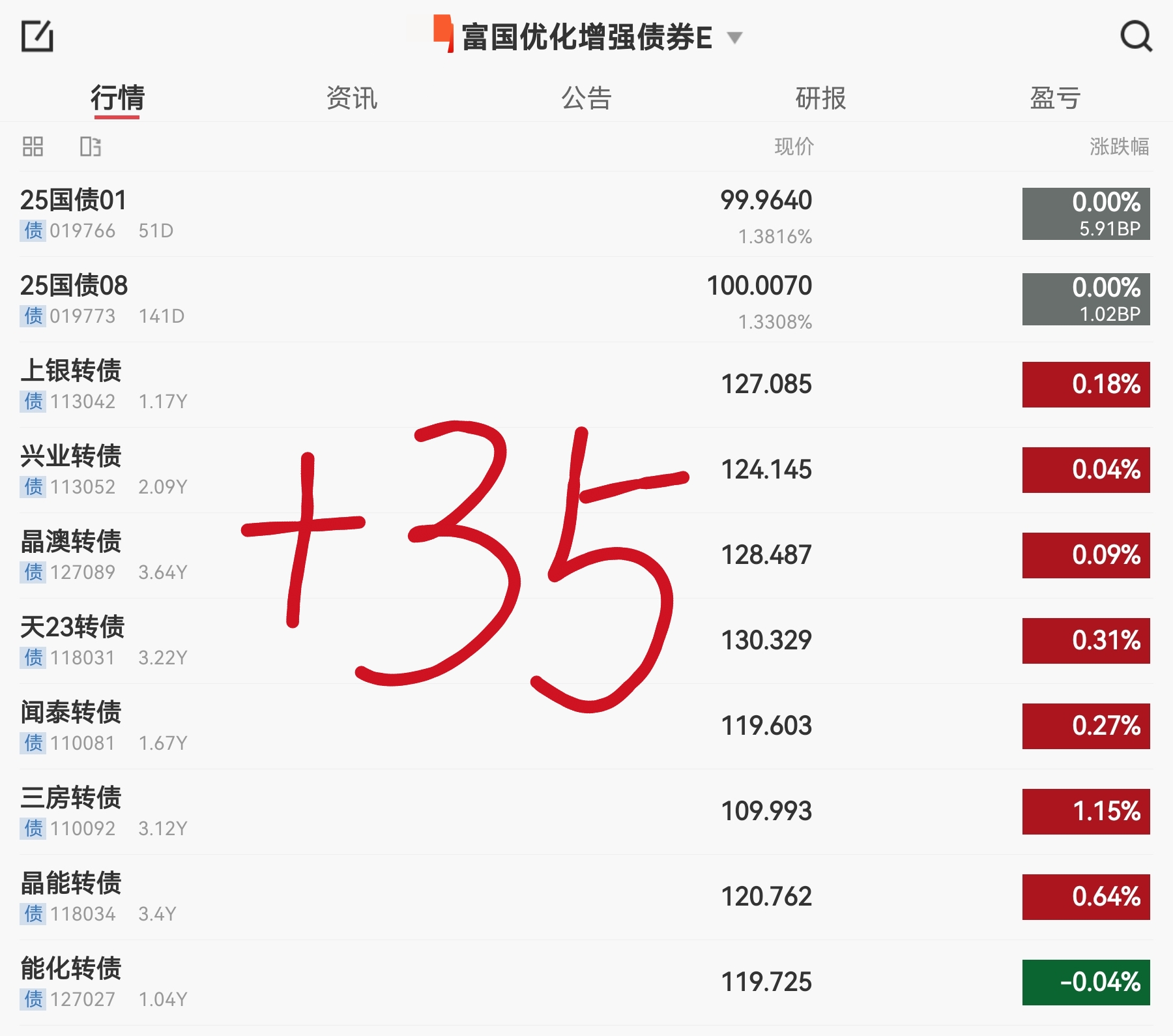 下午权益可转债还在缓慢的回落,不过整体支撑还在,富国优化增强债券E目前收35个蛋15。