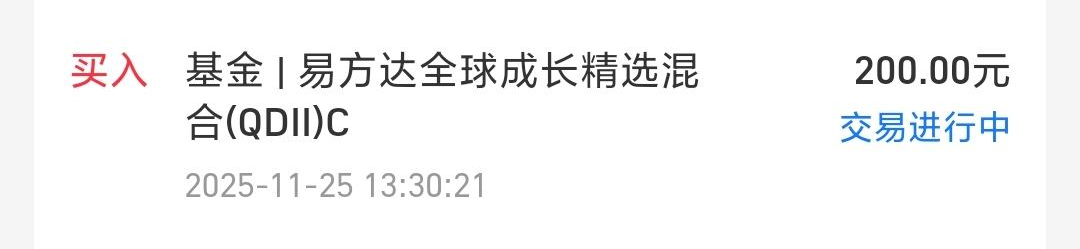 权益基金:今天加仓$易方达全球成长精选混合(QDII)人民币C(OTCFUND|012922)$,买入200元,继续定投权益基金。