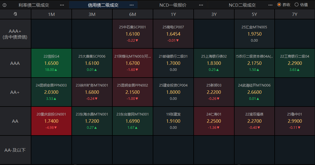 信用债盘中还是以窄幅震荡行情为主,并没有出现明显的拉升,目前从成交矩阵来看,上涨债券还是略多于下跌债券的。