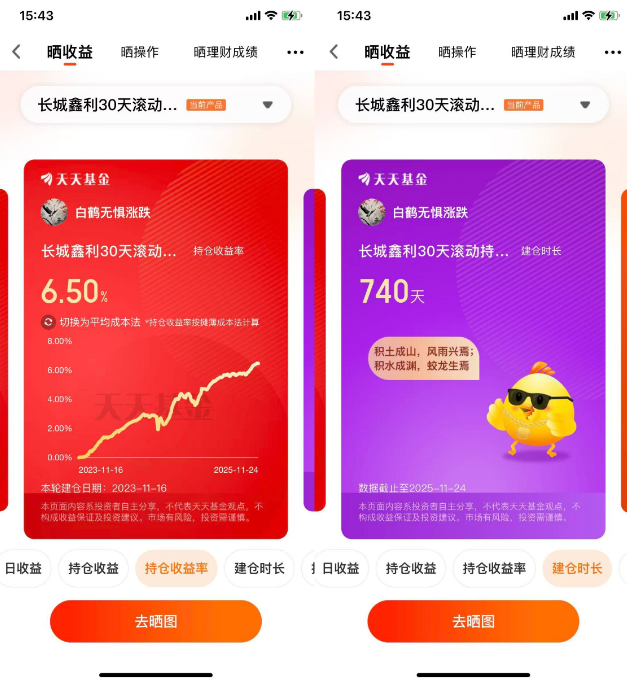 长城鑫利30天C(015992)是我的“固收核心仓”:中短债类型,不收赎回费,锁定期30天不算长,但能过滤短期市场噪音,收益更稳、波动更小。我把它当成“稳健理财蓄水池”,放的是1-2年用不上的闲钱,追求长期稳定的复利收益,这两年6.50%的收益率,比货币基金高不少,还不用担心中途回撤。