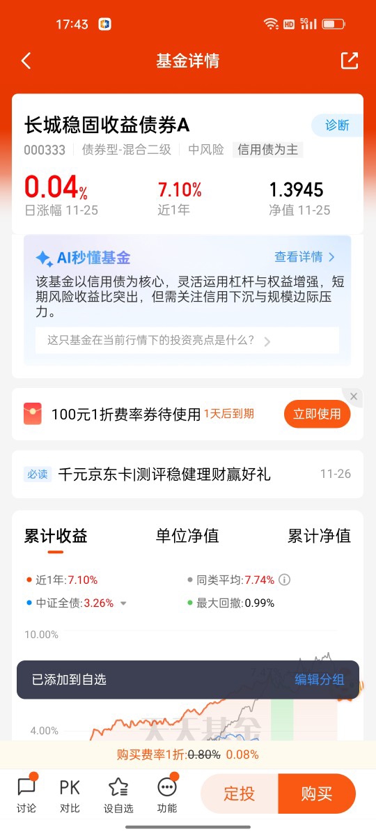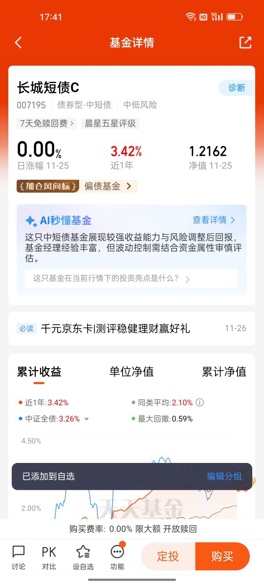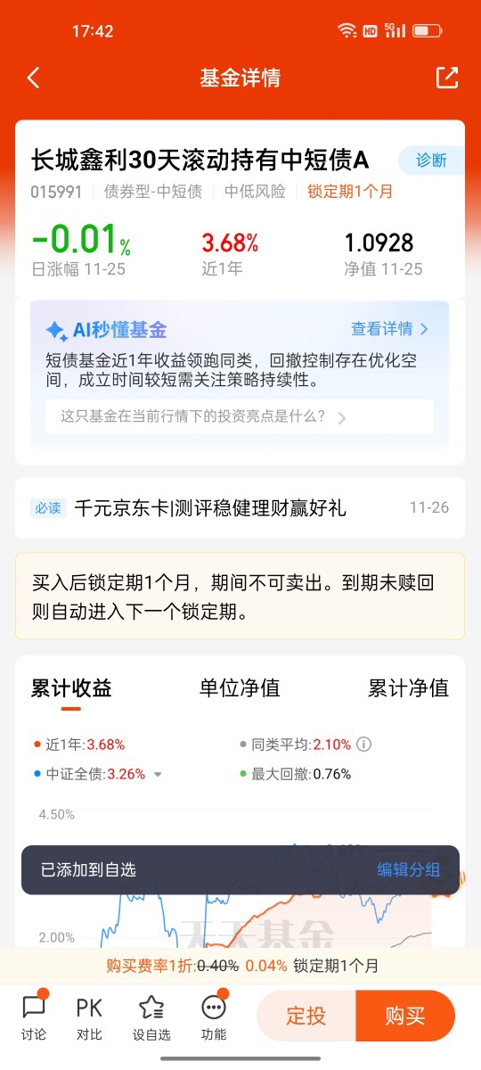 研究下来我发现,稳健理财的关键不是“一刀切”选产品,而是根据资金用途做组合:短期闲置资金放长城鑫利30天,灵活又稳健;核心资金配长城短债,守住基本盘;还有余力就投长城稳固收益,搏一点弹性惊喜。目前我已经把这三只都加入了自选,计划按照这个配置思路逐步布局,在年底震荡的市场里,靠清晰的产品定位和扎实的业绩数据,稳稳锁定收益。