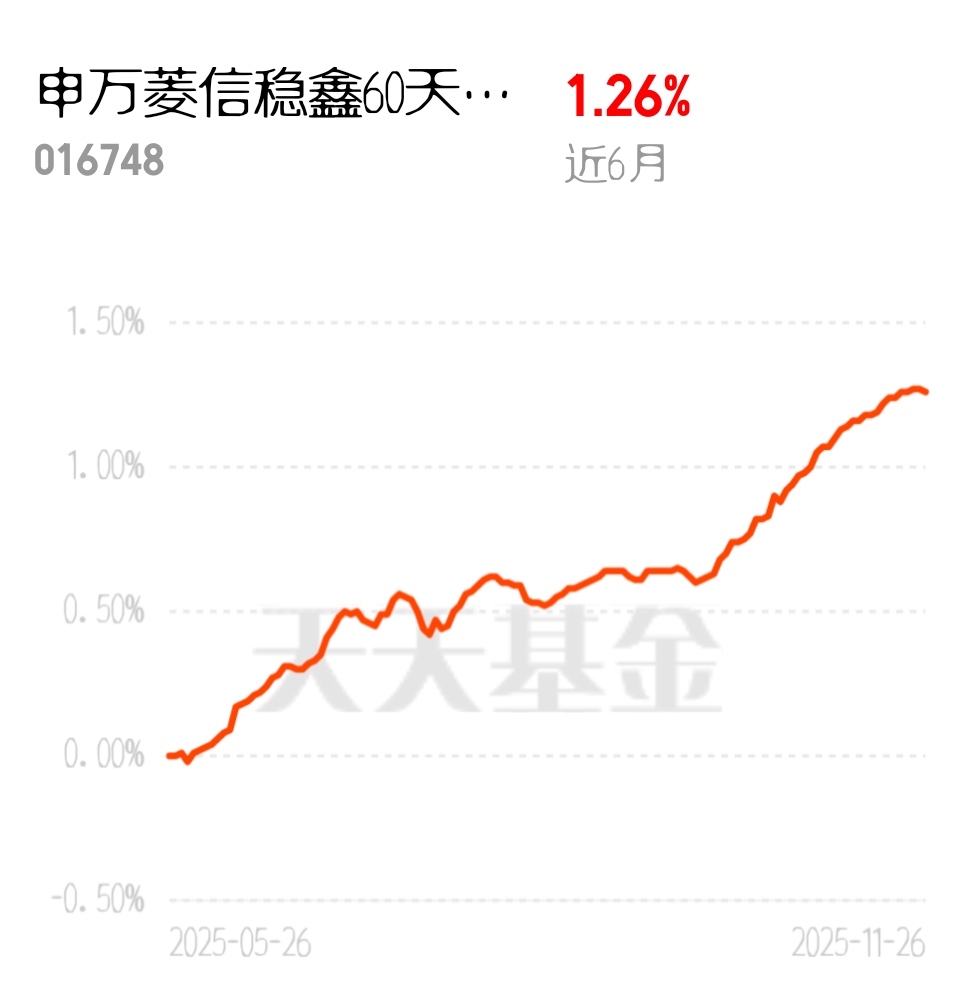 资金持续向稳健资产靠拢,中短债基金成了配置热门,申万菱信稳鑫60天滚动持有中短债债券A近6个月收益1.26%,收益稳健灵活度高,不用锁死资金。