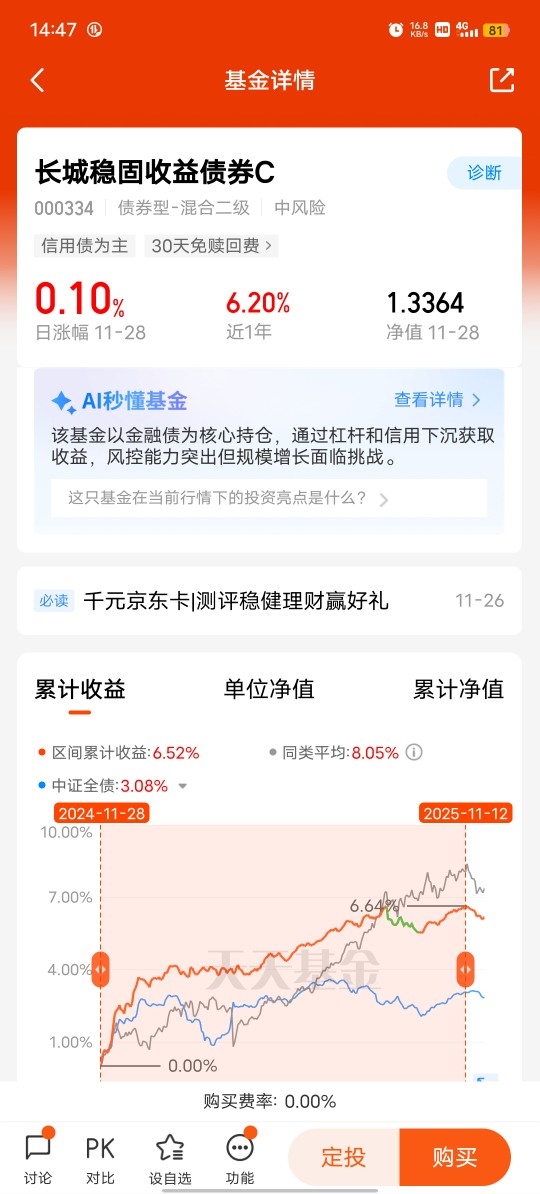 费率较低呢,性价比高,我们买基金,成本也很重要。长城稳固收益债券 C 的管理费是每年 0.6%,托管费每年 0.2%,比一些同类基金便宜不少。而且,持有 7 天以上就没有赎回费了,资金流动性很好。这对咱们普通投资者来说,能省下一笔钱,到手的收益就更多了,性价比超高。