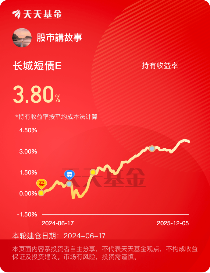 #稳健收益,不止短债#分享我对长城短债的投资体验:去年六月中旬的时候,当时权益市场震荡下跌、比较低迷,债市运行在牛市行情中,我购买了$长城短债E$ ,享受到了稳稳的幸福,目前持仓收益3.8%;今年七月份,权益市场上行,我转出一部分长城短债E,转入了$长城景气成长混合C$ ,进一步加大权益配置。